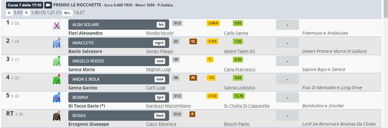 Oggi 21/08 all’Ippodromo dei Pini si sono svolte tre Corse per cavalli Anglo-Arabi. La 1^ Corsa è stata vinta da Alba Solare ( da Freemusic e Andalusea di proprietà di Sanna Carlo, allenato da Rivolta Niccolò e montato da Fiori Alessio ). Qua sotto i risultati e le quote