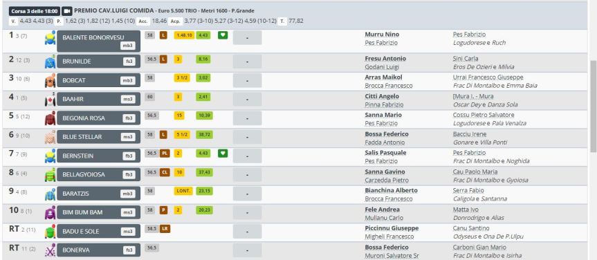 Ooggi 24/08 a Chilivani all’Ippodromo cittadino si sono svolte le corse al galoppo, e due riservwte ai cavalli Anglo-Arabi. Di queste, la 3^ è stata vinta da Balente Bonorvesu ( da Logudorese e Ruch, di proprietà di Pes Fabrizio, allenato da pes Fabrizio e montato da Murru Nino. Qua sotto risultati e quote