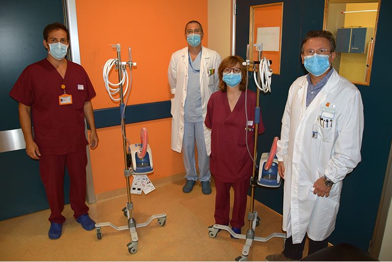 In foto in evidenza lo strumento con il professor Sabino Scolletta, direttore del Dipartimento dell’Emergenza-Urgenza e dei Trapianti, il professor Federico Franchi, coordinatore dell’area Covid, e i rispettivi coordinatori infermieristici, Mariella Magini e Angelo Nuzzo.”