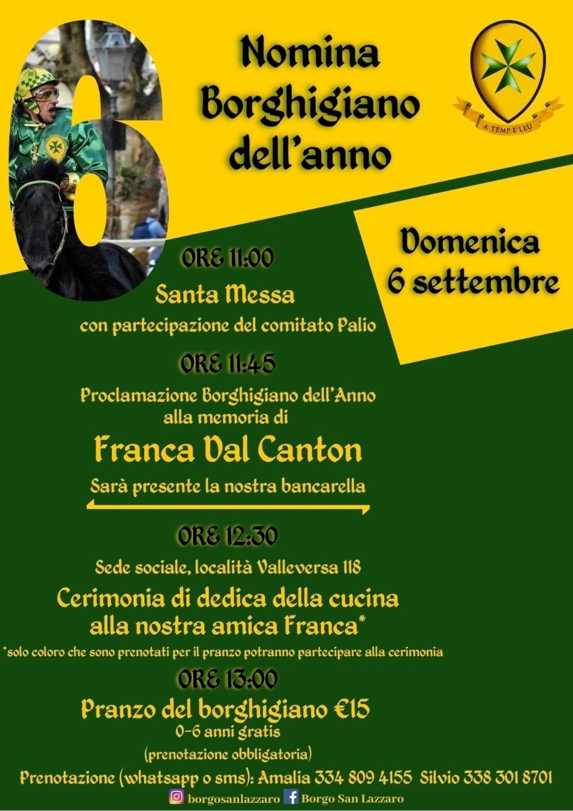 “Anche per il Borgo San Lazzaro un programma di attività per onorare questa settimana. Il Palio è assembramento, è unione. Sono abbracci, grida, canti e lacrime di gioia. Tutto questo la Pandemia ce lo ha negato. Noi il modo di esserci anche in questo anno tribolato lo abbiamo trovato con le giuste procedure ed indicazioni anche aiutati dalla nostra “sede di campagna” a Pontesuero. Per tutti i mesi estivi infatti il Ramarro Bar ed il Ramarro Bistrot hanno riservato ai soci serate all’aperto in sicurezza grazie agli spazi della nostra sede di Pontesuero ed al grandissimo lavoro delle commissioni lavoro dedicate. Veniamo da mesi complessi, di emergenza sanitaria dove come Borgo siamo stati presenti sia con iniziative smart con le piattaforme multimediali ma anche ben radicati a lavorare nel territorio con iniziative di promozione per le attività commerciali e per la distribuzione delle mascherine dapprima nelle frazioni a noi assegnate e poi per l’immenso lavoro di distribuzione delle migliaia di mascherine della Regione in tutto il nostro territorio. Anche questa settimana, quella che doveva essere la nostra settimana più importante, ci saremo. Senza sfilate, con la giusta distanza, sempre all’aperto e con i numeri ridotti. Quello di oggi è l’evento che da qualche anno apre la nostra settimana e che di solito completa l’imbandieramento: lo stradales. I nostri ragazzi hanno realizzato infatti una imponente decorazione sul sagrato della chiesa con lo stemma, il motto ed i colori. Venerdì sera poi propizieremo un migliore anno paliesco con una cena riservata nella nostra sede e domenica onoreremo il nostro giorno con la Messa del Palio nella nostra parrocchia e renderemo omaggio alla nostra Franca e con lei a tutti quelli che l’hanno seguita nell’ultimo viaggio. Con orgoglio e tristezza ma anche con la gioia ed il conforto che ci da lo stare insieme. La messa sarà alle 11 sul sagrato della chiesa, all’aperto per poter consentire un migliore distanziamento e vedrà la partecipazione del comitato Palio, la proclamazione del Borghigiano dell’Anno alla memoria di Franca DalCanton e la presenza della Bancarella, di alcuni figuranti e di una rappresentanza di sbandieratori e musici. Dopo la messa, sempre nella nostra sede, il pranzo del Borghigiano. Quest’anno abbiamo dovuto “mettere in pausa la Corsa” ma abbiamo dimostrato che il Palio c’è, che San Lazzaro c’è. Che siano per tutti gli astigiani giornate serene e che vengano tempi migliori. Come sempre A Temp e Leu. W il Palio di Asti!”