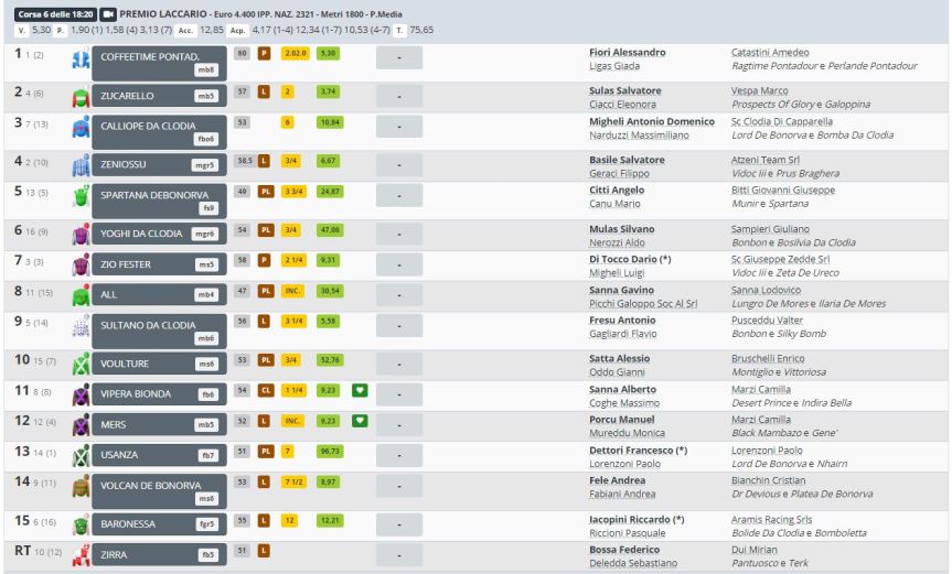 Alla sesta Corsa ha vinto Coffetime Pontadour ( da Ragtime Pontadour e Perlande Pontadour, di proprietà di Catastini Amedeo, allenato da Ligas Giada e montato da Fiori Alessandro ). Qua sotto risultati e quote