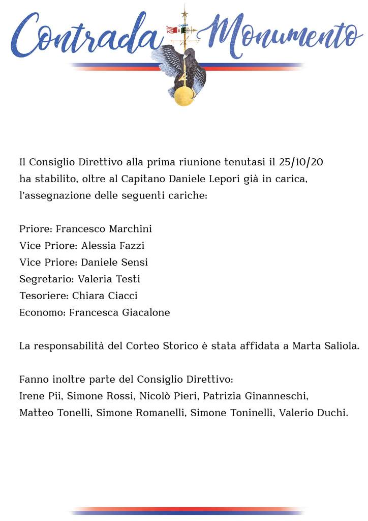 La Contrada Monumento comunica che sono stati eletti Priore Francesco Marchini e Capitano Daniele Lepori, già in carica. Qua sotto il quadro completo delle elezioni