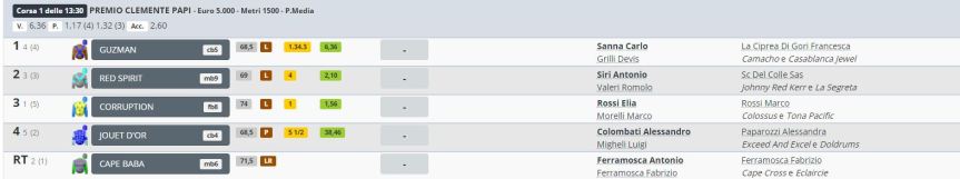 Oggi 07/11 a Pisa alla 1^ Corsa il fantino del Palio di Siena Carlo Sanna detto “Brigante” ha colto l’ennesimo prestigioso successo in Ippdormo, sul cavallo Guzman. “Brigante” oltre che ottimo fantino in Palii e Corse in Provincia, sta dimostrando a tutti di essere anche un’ottimo fantino in categoria G.R. in Ippodromo mietendo successi su successi. Si classifica alle spalle di “Brigante” al secondo posto il fantino Antonio Siri detto “Amsicora” sul cavallo Red Spirit. Faccio i complimenti a entrambi perchè si distinguono sempre, e si fanno notare sempre con onore in categoria G.R. Qua sotto risultati, quote della corsa