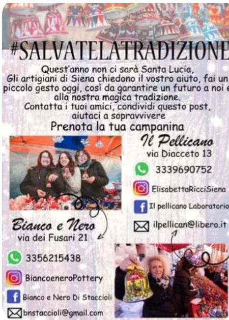 Siena, Santa Lucia, gli artigiani senesi: “Salvate la tradizione, prenotate le campanine” per l’articolo cliccare qua https://www.radiosienatv.it/santa-lucia-artigiani-senesi-tradizione-campanine/ Condividi sul web: Fai clic per condividere su Facebook (Si apre in una nuova finestra) Facebook Fai clic per condividere su WhatsApp (Si apre in una nuova finestra) WhatsApp Fai clic per condividere su Telegram (Si apre in una nuova finestra) Telegram Fai clic per condividere su X (Si apre in una nuova finestra) X Fai clic qui per stampare (Si apre in una nuova finestra) Stampa Fai clic per inviare un link a un amico via e-mail (Si apre in una nuova finestra) E-mail Mi piace Caricamento... Correlati