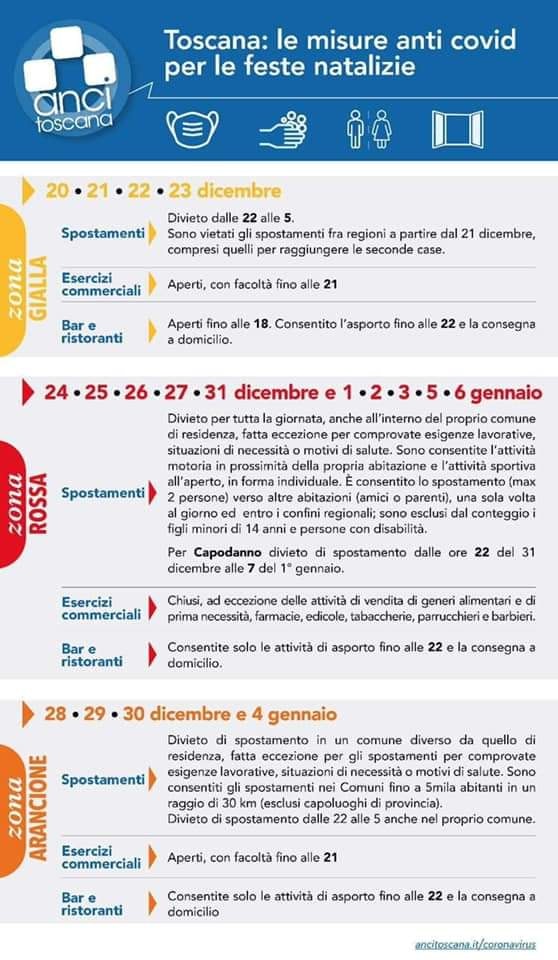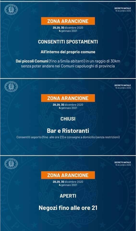 - nei giorni 28, 29, 30 dicembre 2020 e 4 gennaio 2021, sull’intero territorio nazionale, si applicano le misure previste dal decreto del Presidente del Consiglio dei ministri 3 dicembre 2020 per le cosiddette “zone arancioni”, cioè le aree caratterizzate da uno scenario di elevata gravità e da un livello di rischio alto. Negli stessi giorni, sono tuttavia consentiti gli spostamenti dai Comuni con popolazione massima di 5.000 abitanti verso località distanti non più di 30 chilometri, con esclusione in ogni caso degli spostamenti verso i capoluoghi di provincia;