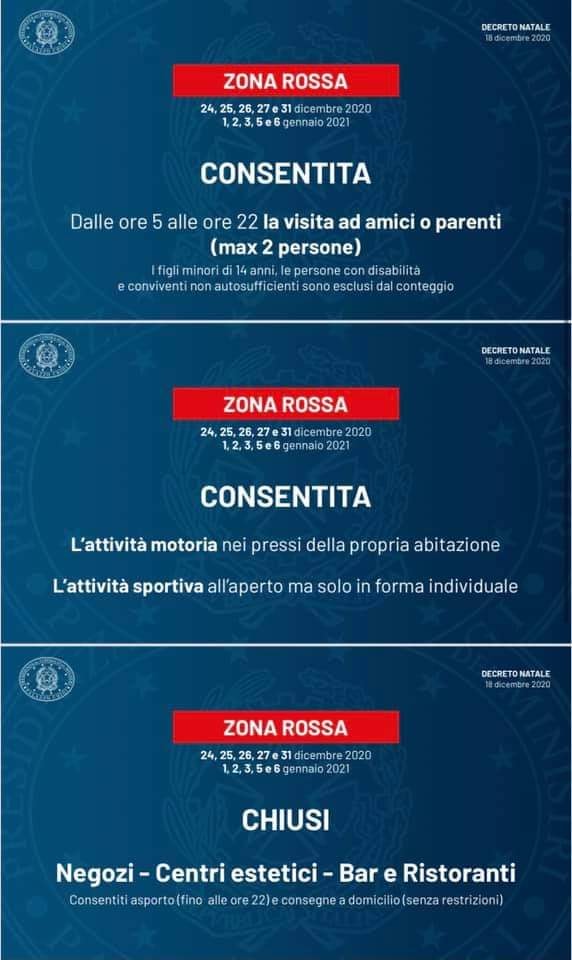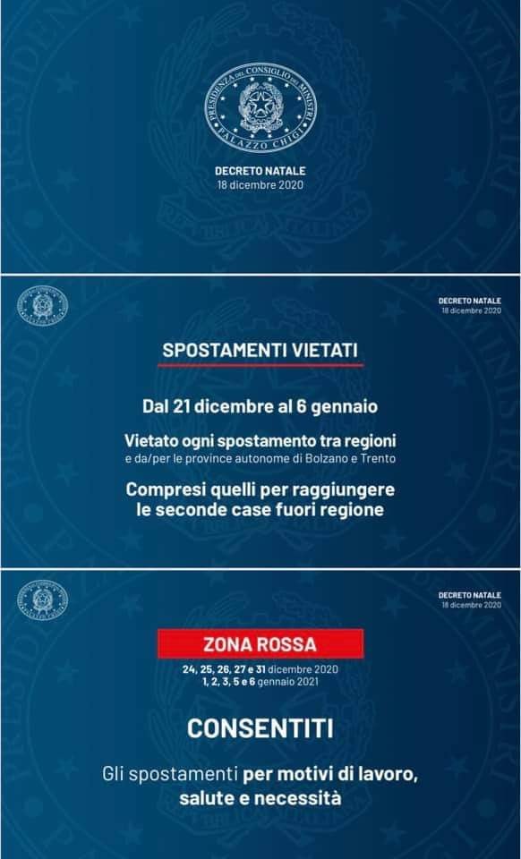 - nei giorni festivi e prefestivi compresi tra il 24 dicembre 2020 e il 6 gennaio 2021, sull’intero territorio nazionale, si applicano le misure previste dal decreto del Presidente del Consiglio dei ministri 3 dicembre 2020 per le cosiddette “zone rosse”, cioè le aree caratterizzate da uno scenario di massima gravità e da un livello di rischio alto;