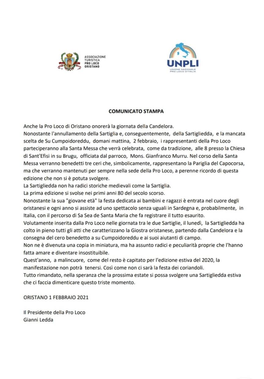 Comunicato Stampa Pro Loco Oristano, dove annucia di onorare “La Candelora”