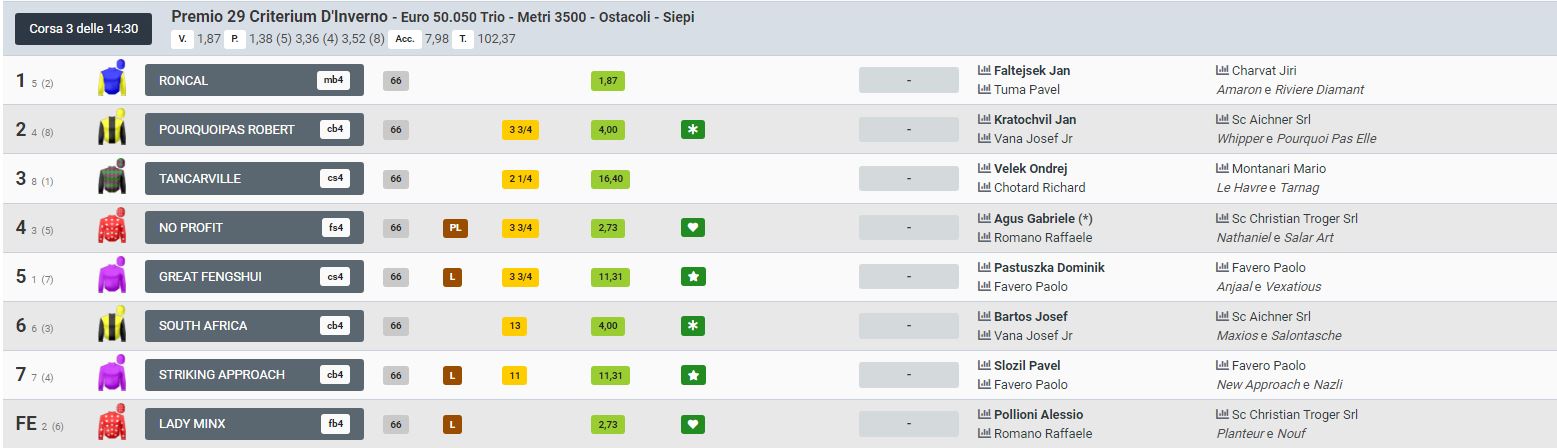 Oggi a Pisa presso l’Ippodromo di San Rossore si sono svolte delle Corse. Il 23° Criterium d’inverno è stato vinto da Roncal. Per i rrisultati e quote guardare sotto