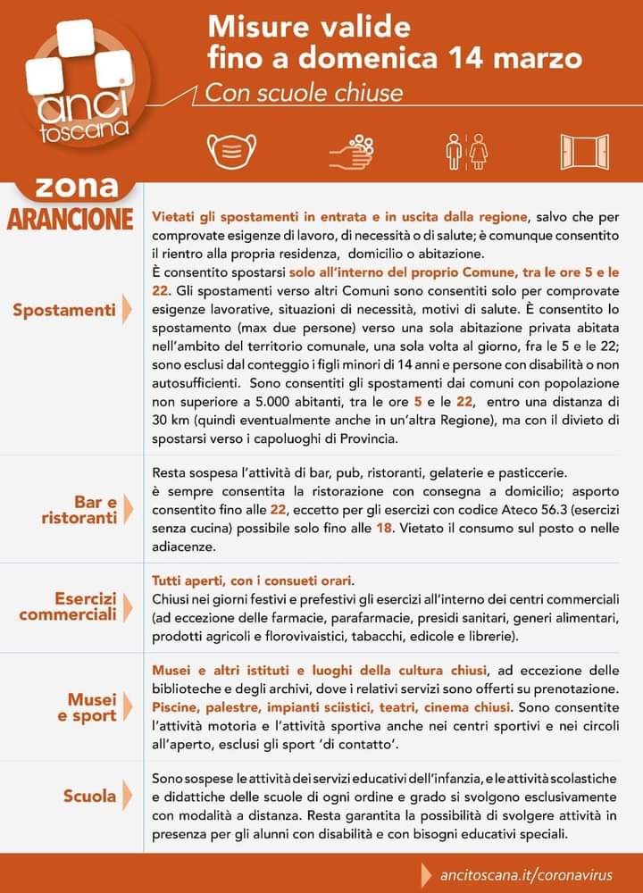 ➡️Nelle zone arancioni restano chiusi i musei, così come i cinema, i teatri, le palestre e le piscine. È possibile praticare attività sportiva purché all’interno del proprio comune e all’aperto.