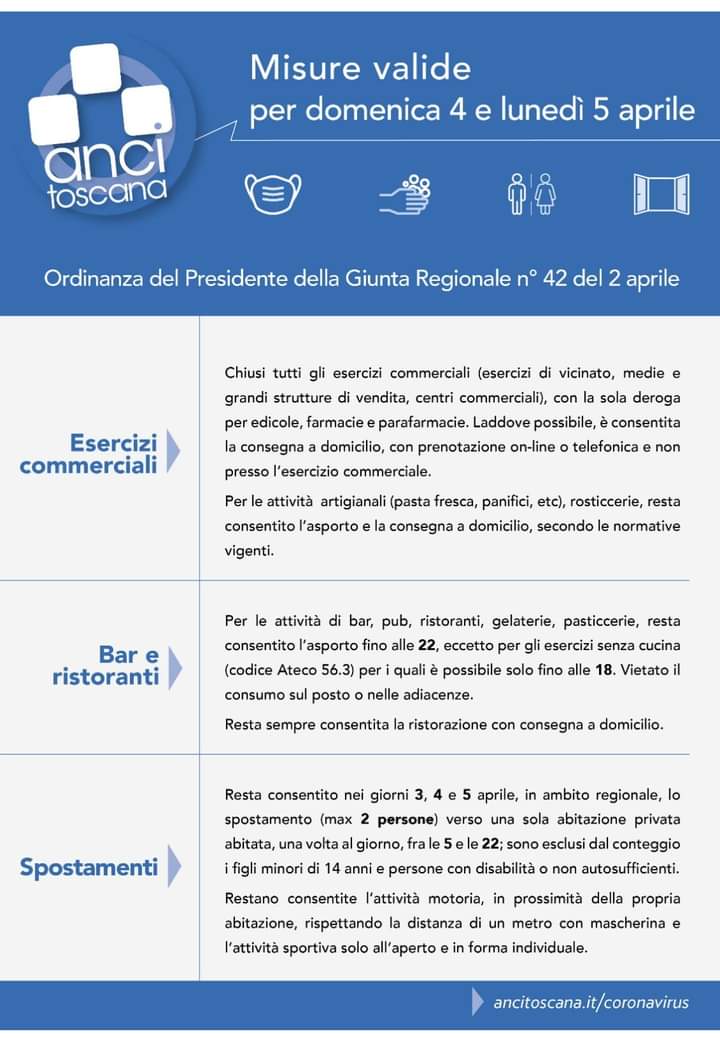 Come anticipato sulla nostra testata, il presidente della Regione Toscana Eugenio Giani ha emanato un’ordinanza per i giorni di Pasqua e Pasquetta, riassunta nell’infografica e che va a introdurre nuove misure regionali nell’ambito degli esercizi commerciali, di bar e ristoranti, e degli spostamenti.