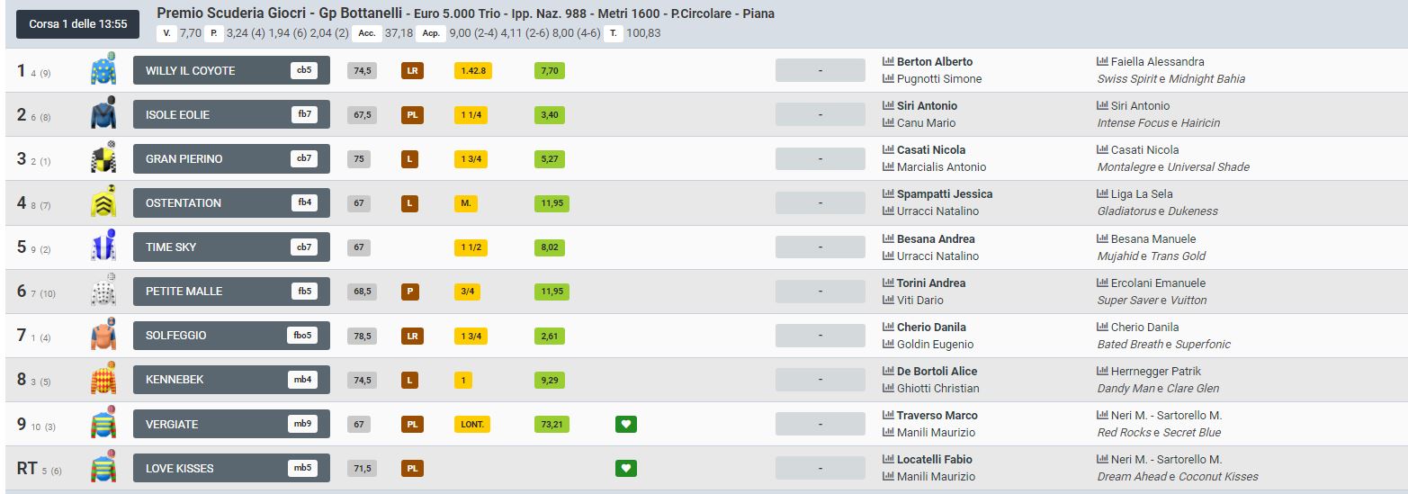 Oggi 03/04 a Milano si sono s volte delle corse, una delle quali riservata alla categoria G.R. la 1^ Corsa è stata vinta da Alberto Berton su EWilly il Coiote, secondo posto per Antonio Siri detto “Amsicora” su Isole Eolie e terzo posto per Nicola Casati su gran Pierino. Ottimo piazzamento pe Amsicora sul proprio cavallo di scuderia Isole Eolei, e “Amsicorw” che dimostra ancora la sua grande adattabilità in G.R.