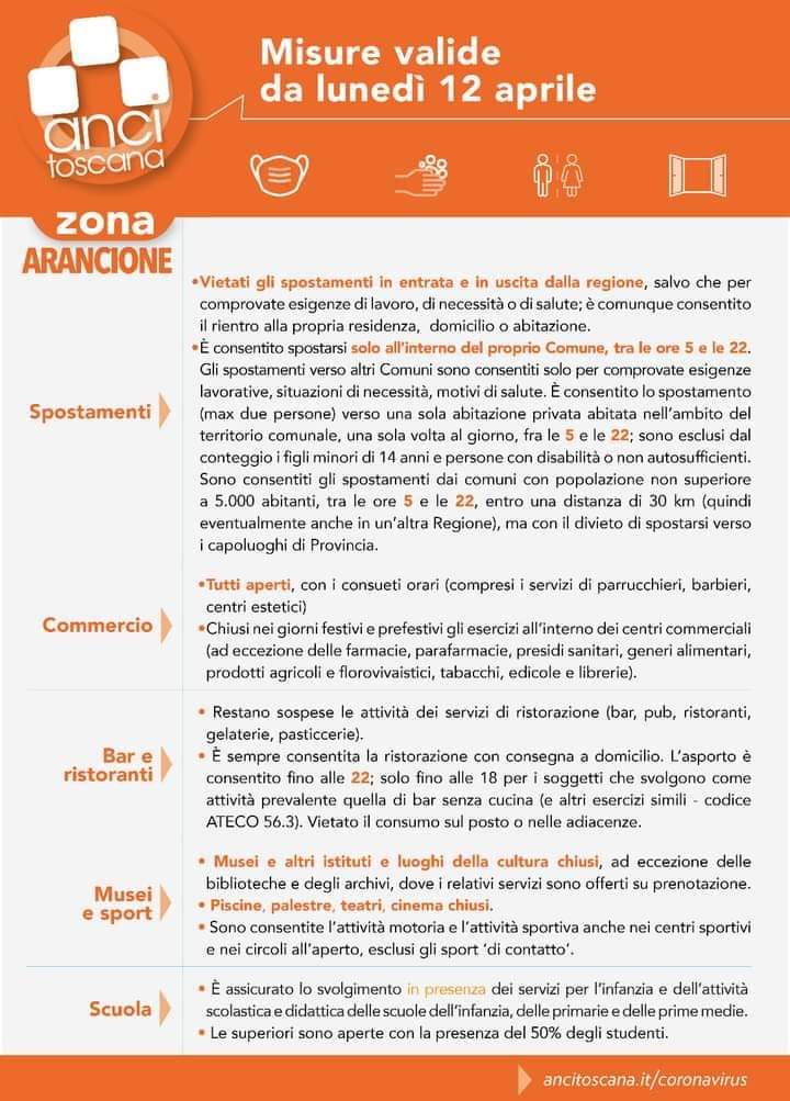Siena e Provincia: Le regole da seguire in zona Arancione dal 12/04 Queste le regole da seguire in Zona Arancione dal 12/04, esclusa la zona della Valdelsa Senese, ancora in Zona Rossa locale. Condividi sul web: Fai clic per condividere su Facebook (Si apre in una nuova finestra) Facebook Fai clic per condividere su WhatsApp (Si apre in una nuova finestra) WhatsApp Fai clic per condividere su Telegram (Si apre in una nuova finestra) Telegram Fai clic per condividere su X (Si apre in una nuova finestra) X Fai clic qui per stampare (Si apre in una nuova finestra) Stampa Fai clic per inviare un link a un amico via e-mail (Si apre in una nuova finestra) E-mail Mi piace Caricamento... Correlati