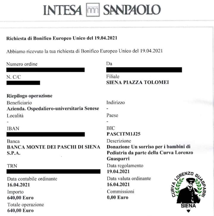 “Vogliamo ancora una volta rivolgere un grande ringraziamento ai tifosi, alle associazioni, alle attività commerciali e a tutti i senesi che hanno sposato questa nostra iniziativa – prosegue la nota – fornendoci il proprio contributo economico e logistico. Il nostro è solo un piccolo gesto ma che unisce simbolicamente tutta la cittadinanza in un momento in cui tutti siamo alle prese con le difficoltà conseguenti a questa situazione drammatica”.