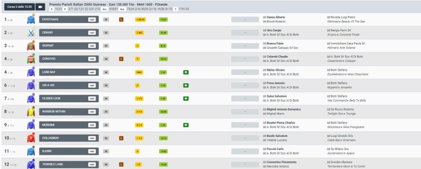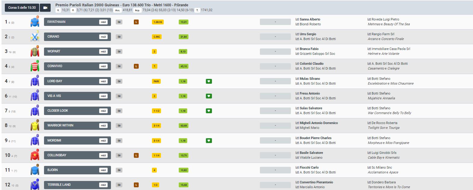 Oggi 25/04 a Roma si sono svolte delle corse, fra le quali il Parioli e il premio Regina Elena. la 5^ corsa premio parioli è stato vinto da Alberto Sanna su Fayathaan, secondo Sergio Urru su Cirano e terzo Fabio Branca su Wopart.