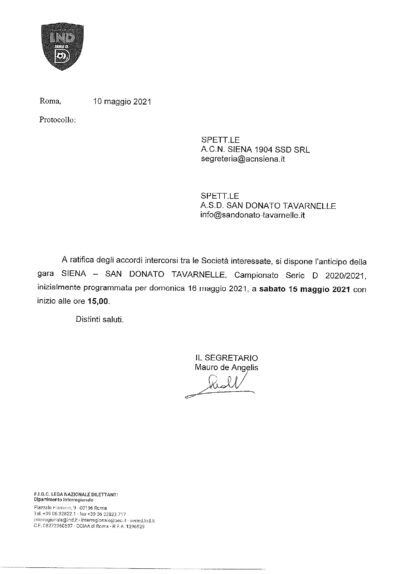 E’ ufficiale l’anticipo della partita tra Acn Siena e San Donato Tavarnelle, gara che si giocherà sabato prossimo 15 maggio allo stadio Franchi di Siena, con fischio d’inizio alle ore 15 (invece che domenica 16 maggio alle 16, come da calendario). E’ arrivata infatti la comunicazione ufficiale da parte della LND, dopo gli accordi intercorsi tra le due società. La partita è valevole per la dodicesima giornata di ritorno del campionato di serie D.