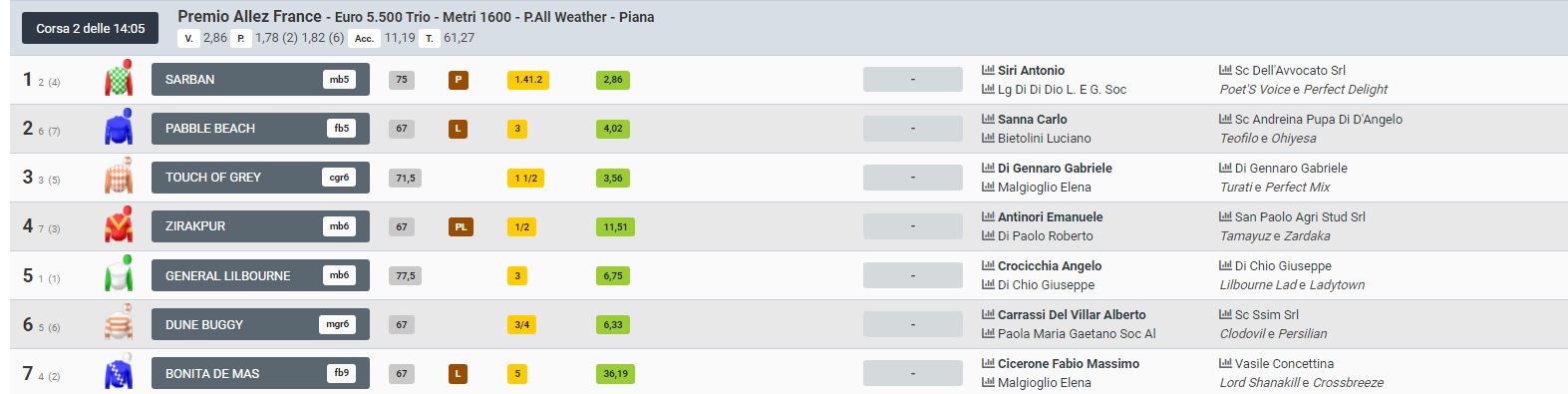 Oggi 11/05 a Roma si sono svolte delle corse, una delle quali riservata alla categoria G.R. La 2^ corsa ès tata vinta da Antonio Sirir detto “Amsicora” su Sarban al secondo posto Carlo Sanna detto”Brigante” su Pabble Beach e al terzo posto Gabriele Di Gennaro su Touch of Grey. Ottima vittoria per “Amsicor” che si evidenzia ancora come un grande prontaginista in G.R. alla pari di “Brigante” che ottiene un ottimo piazzamnto dimostrando anche lui di avere stoffa in questa categoria.