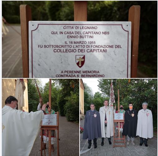 In occasione dell’investitura della Reggenza di San Bernardino, è stata scoperta la targa marmorea che la Contrada ha dedicato nel 65esimo anno di fondazione del Collegio dei Capitani e delle Contrade, in ricordo del primo atto di fondazione il 16 marzo del 1955, a casa del Capitano biancorosso Ennio Buttini