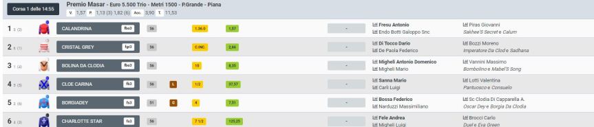 La 6^ corsa è stata vinta da Cupido Mio ( da Pantuosco e Suete Rapida, di proprietà di Team Atzeni Srl, allenato da Geraci Filippo e montato da Mario Sanna ). Al secondo posto Galateo da Clodia con Salvatore Basile e al terzo posto Elio da Clodia con Salvatore Sulas.