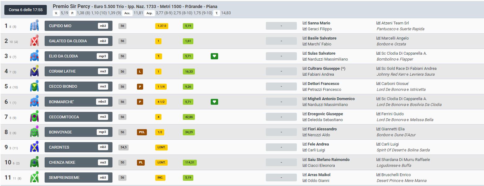 La 6^ corsa è stata vinta da Cupido Mio ( da Pantuosco e Suete Rapida, di proprietà di Team Atzeni Srl, allenato da Geraci Filippo e montato da Mario Sanna ). Al secondo posto Galateo da Clodia con Salvatore Basile e al terzo posto Elio da Clodia con Salvatore Sulas.
