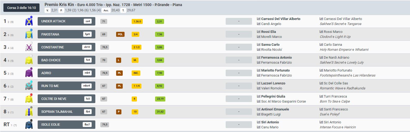Oggi 03/06 a Firenze presso l’Ippodromo Visarno si sono svolte delle corse, una delle quali riservate alla categoria G.R. La 3^ corsa è stata vinta da Alberto Carrassi Del Villar su Under Attack. Al secondo posto Elia Rossi su Pakistana e al terzo posto Carlo Sanna detto “Brigante” su Constantine.