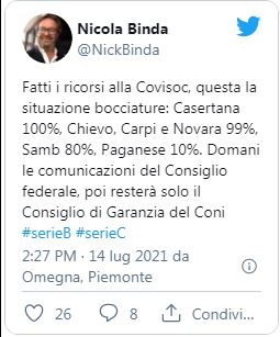 Qua sootto il tweet di Nicola Binda de La Gazzetta dello Sport, salterebbero 5 club: Casertana, Chievo, Carpi, Novara e Sambenedettese. Si salverebbe invece la Paganese.