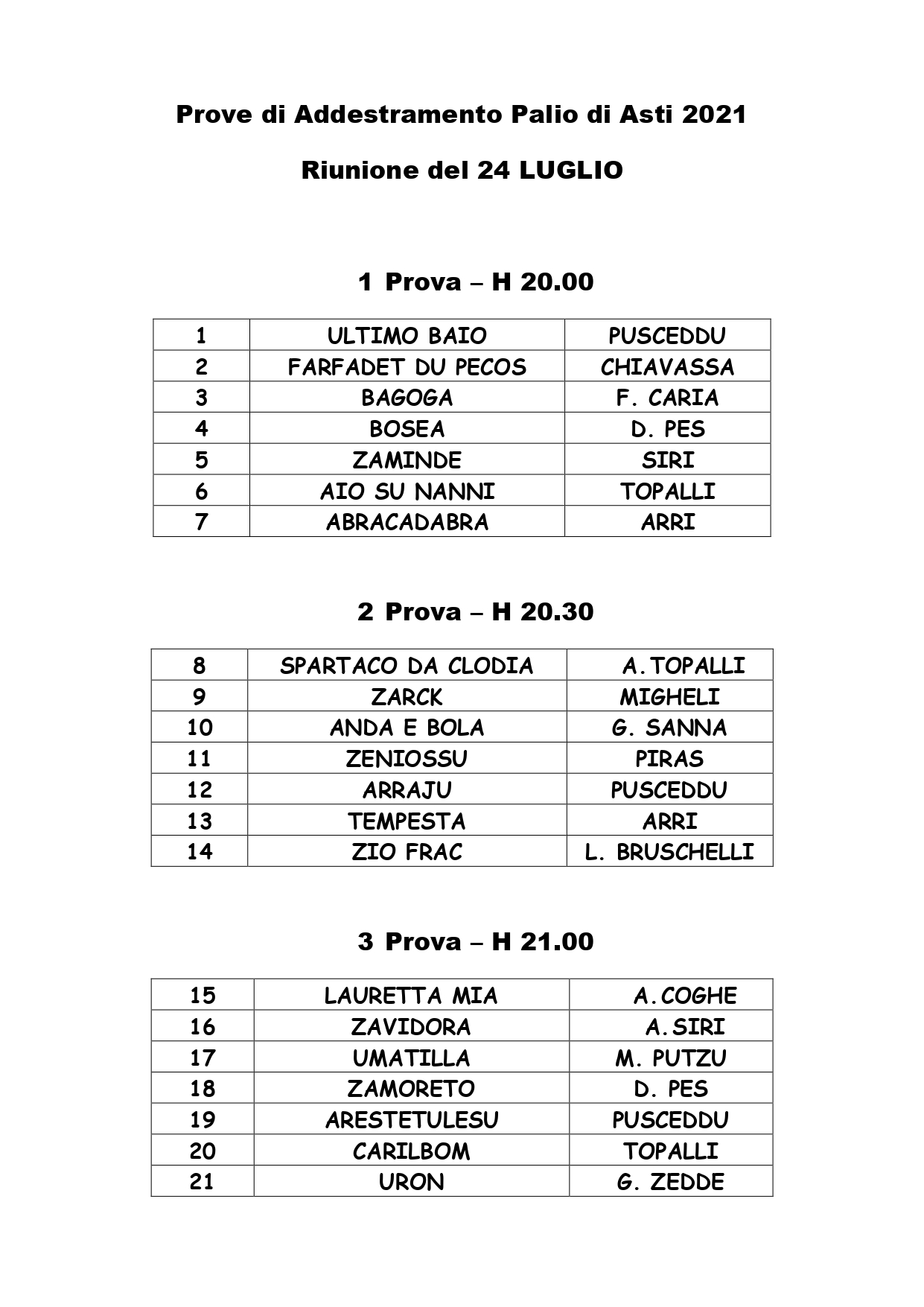 Mi sono appena giunte le batterie delle Corse di Addestramento del Palio di Asti del 24/07 che si svolgeranno alla pista dello Stadio Censin Bosia. Si tratta di sei batterie con inizio alle ore 20.00 e l’ultima in programma alle ore 23.00.