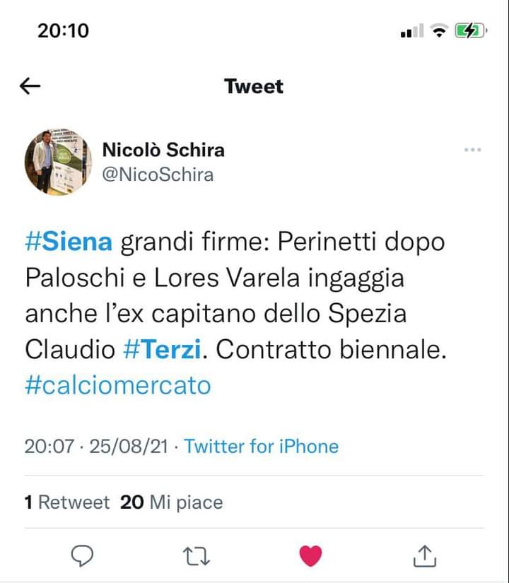Siena, Acn Siena: Preso Claudio Terzi, contratto biennale Il Siena ha preso Claudio Terzi, difensore ex Spezia, in Serie A con i liguri lo scorso campionato. A rivelarlo Niccolò Schira. Condividi sul web: Fai clic per condividere su Facebook (Si apre in una nuova finestra) Facebook Fai clic per condividere su WhatsApp (Si apre in una nuova finestra) WhatsApp Fai clic per condividere su Telegram (Si apre in una nuova finestra) Telegram Fai clic per condividere su X (Si apre in una nuova finestra) X Fai clic qui per stampare (Si apre in una nuova finestra) Stampa Fai clic per inviare un link a un amico via e-mail (Si apre in una nuova finestra) E-mail Mi piace Caricamento... Correlati