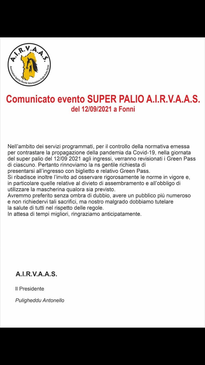 Qua sotto il comunicato stampa Airvaas su ciò che concerne il controllo scupoloso dei Grenn Pass e la richiesta di osservare le disposizioni anti Covid al Super Palio di Fonni del 12/09