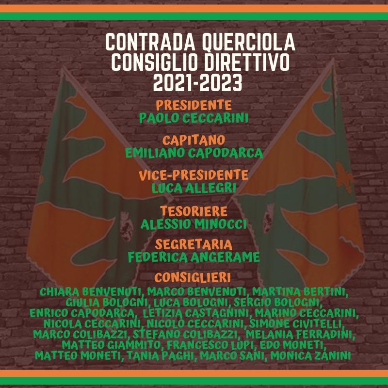 La Contrada Querciola ha eletto il nuovo Direttivo per l’anno paliesco 2022-2023. Emiliano Capodarca eletto Capitano, mentre Presidente è stato eletto paolo Ceccarini. uq sotto il dettaglio delle cariche.