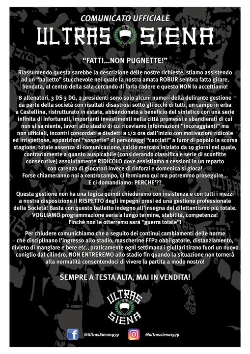 8 allenatori, 3 DS 3 DG, 2 presidenti sono solo alcuni numeri della delirante gestione da parte della società con risultati disastrosi sotto gli occhi di tutti, un campo in erba a Castellina, ristrutturato in estate, abbandonato a beneficio del sintetico con una serie infinita di infortunati, importanti investimenti nella città promessi e sbandierati di cui non si sa niente, lavori allo stadio di cui riceviamo informazioni “incoraggianti” ma non ufficiali, incontri concordati e disdetti a 1/2 ora dall’inizio con motivazioni ridicole ed irrispettose, apparizioni “sospette” di personaggi “cacciati” a furor di popolo la scorsa stagione, totale assenza di comunicazione, calcio mercato iniziato da 19 giorni nel quale, contrariamente a quanto auspicabile (considerando classifica e serie di sconfitte consecutive) assolutamente RIDICOLO dove assistiamo a cessioni in un reparto con carenza di giocatori invece di rinforzi e domenica si gioca!