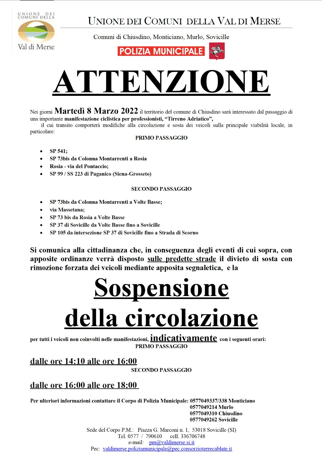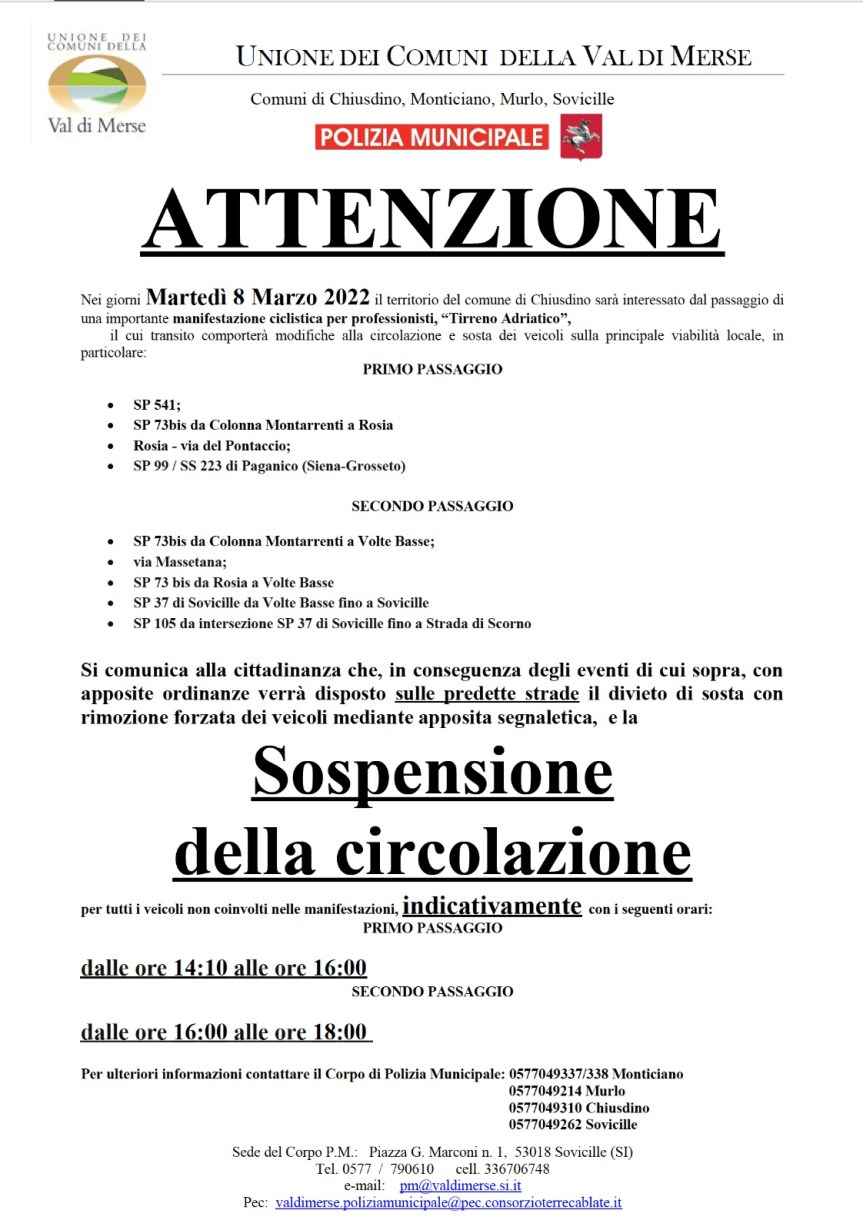 Provincia di Siena, Unione Comuni Val di Merse: Domani 08/03 Le limitazioni al traffico per passaggio Tirreno-Adriatico Qua sotto troverete le limitazioni al traffico nei Comuni della Val di Merse per il passaggio della gara ciclistica Tirreno-Adriatico. Condividi sul web: Fai clic per condividere su Facebook (Si apre in una nuova finestra) Facebook Fai clic per condividere su WhatsApp (Si apre in una nuova finestra) WhatsApp Fai clic per condividere su Telegram (Si apre in una nuova finestra) Telegram Fai clic per condividere su X (Si apre in una nuova finestra) X Fai clic qui per stampare (Si apre in una nuova finestra) Stampa Fai clic per inviare un link a un amico via e-mail (Si apre in una nuova finestra) E-mail Mi piace Caricamento... Correlati