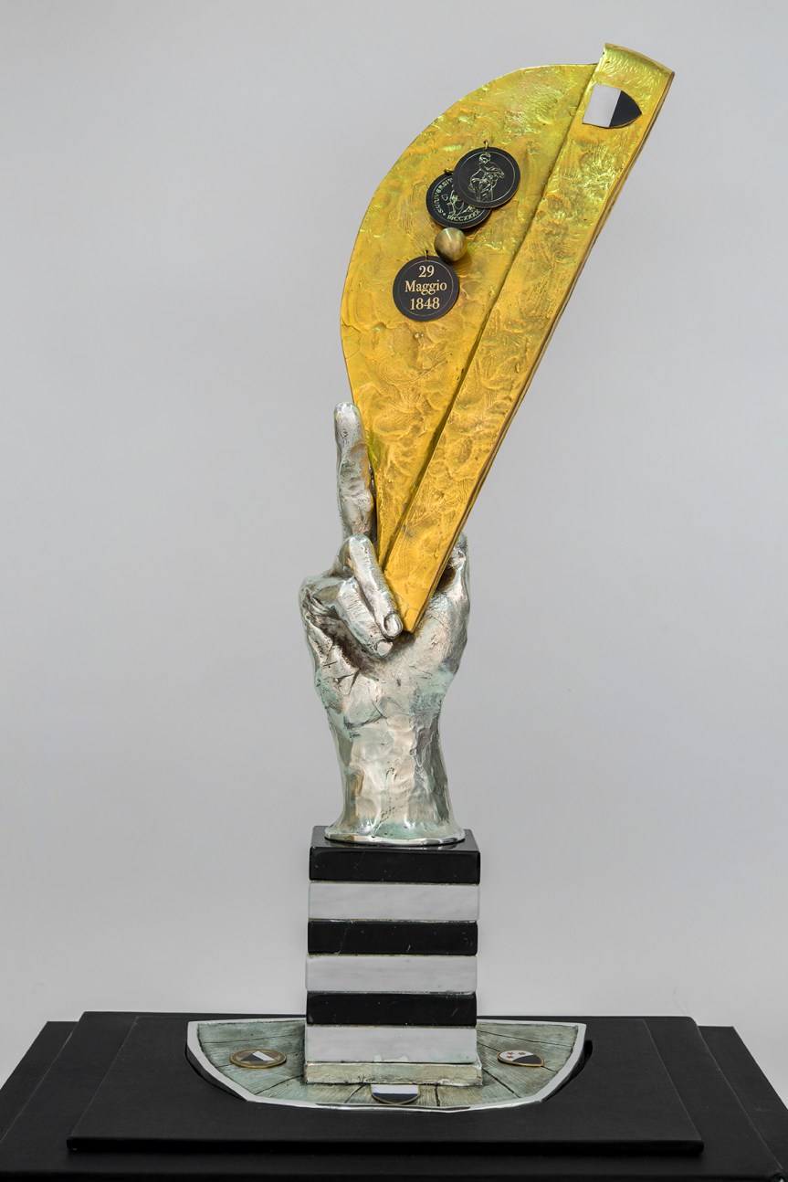 Ed è proprio la mano, l’elemento scultoreo più amato da Mortet. Tante le mani celebri realizzate nella sua bottega di Roma. Da quella di Ennio Morricone a quella di Quentin Tarantino, Robert De Niro, Kirk Douglas. Il motivo di questa passione? Perché è con le mani che si crea la bellezza, soprattutto quella che nasce dall’estro creativo di un grande artista come Mortet, erede di un antico sapere artigiano. E sempre con le mani si comunica, non solo attraverso un’opera, ma anche con un gesto, una carezza, una stretta di mano, appunto. Ecco quindi che la sua firma stilistica si ritrova appieno in questo Masgalano. In quella bellissima mano in bronzo, placcata in argento, tesa verso l’alto e carica di simbologia con una duplice interpretazione. Ed è proprio in questo doppio significato gestuale: la mano dello studente alzata al cielo che stringe il goliardo nell’intonare l’inno del Gaudeamus, e quella dalla “lettura”