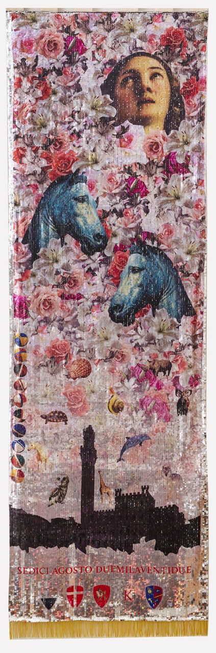 Il drappellone di Andrea Anastasio per il Palio del 16 agosto 2022 è un segno, un medium, un gesto forte che unisce la ricerca dell’artista con questo evento storico che è ancor così vivo e potente. Il Palio è l’incontro tra l’umano e il divino tramite la forza scellerata di cavalli, anche essi mezzo di trasmutazione e trasformazione che portano Siena in alto, nel divino femminile rappresentato dall’Assunta.