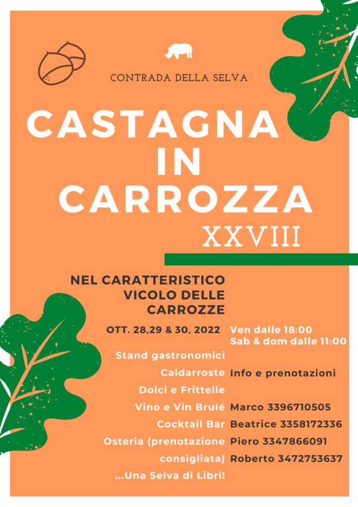 CASTAGNA IN CARROZZA: da venerdì 28 a domenica 30 ottobre si svolgerà la XXVIII edizione della Castagna in Carrozza nel caratteristico vicolo delle Carrozze, dalle 18 per la giornata di venerdì e dalle ore 11 per le giornate di sabato e domenica, con le tradizionali caldarroste, le frittelle di castagne, il Vin Brulè e il castagnaccio!