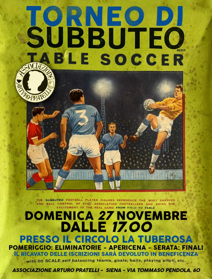 L’associazione Arturo Pratelli è lieta di annunciare l’organizzazione del primo torneo di Subbuteo “Arturo Pratelli”. Il torneo si svolgerà presso il Circolo La Tuberosa in via Vallepiatta, 20. Iscrizione aperta a tutti al costo di 8 euro. L’eliminatorie si svolgeranno a partire dalle ore 17, seguirà apericena al costo di 12 euro per poi concludere successivamente con la fase finale! Vi aspettiamo numerosi! Per le iscrizioni potete contattare i seguenti numeri:
