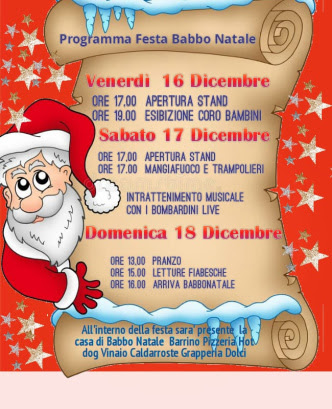 Nei giorni 16, 17 e 18 Dicembre torna il Villaggio di Babbo Natale con i seguenti stand: Barrino, Vinaio, Salsicce e hotdog, Caldarroste e vin brulè, Grapperia, Dolci e cioccolate calde, Pizzeria.