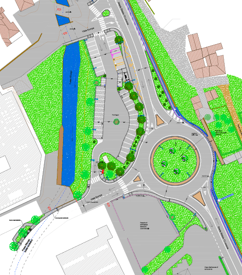 L’intervento. L’intervento ha la finalità di aumentare la sicurezza stradale e migliorare la viabilità trasformando l’attuale intersezione a raso tra viale Europa e la ex Ss 73 Levante “Senese – Aretina” in una intersezione a circolazione rotatoria. Le intersezioni a rotatoria, infatti, presentano una sicurezza maggiore rispetto ai tradizionali incroci a raso in quanto eliminano i punti di conflitto comportanti l’intersezione delle correnti veicolari e la loro geometria induce una riduzione della velocità dei veicoli in transito. La nuova intersezione a rotatoria presenta un ingombro maggiore di quella esistente ed invade ad est la scarpata presente lungo la ex ss 73, a nord ovest una zona a verde e l’accesso al parcheggio esistente di viale Europa, a sud ovest una parte del resede della concessionaria di autovetture ed una zona asfaltata che costituiva il vecchio accesso all’area del distributore di carburanti. Per garantire il corretto posizionamento della rotatoria il più possibile “in asse” con l’attuale tracciato della ex Ss n. 73 “Levante” è prevista la costruzione di una grande opera di sostegno, dall’andamento curvilineo, per la scarpata sul lato est, costituita da una paratia centrale di pali con due tratti di estremità di muri a retta. La realizzazione della nuova rotatoria comporterà anche la riorganizzazione funzionale delle due aree di sosta esistenti (circa 45 posti auto, 10 moto e 10 biciclette), la creazione di aree marginali a verde ed alberate, la messa in sicurezza della fermata del Tpl in direzione Sud e la ricucitura del percorso pedonale che proviene dai Due Ponti e prosegue quindi in viale Europa. L’accesso al parcheggio esistente di viale Europa sarà pertanto spostato e la sua geometria è stata studiata per contenere l’ingombro verso la sponda presente sul fosso di Riluogo. La realizzazione della rotatoria in progetto si configura quindi come un intervento di moderazione del traffico e potrà garantire la regolamentazione in modo più appropriato ed efficiente dell’ingresso e dell’uscita dall’area commerciale ed artigianale (viale Europa) nonché dal parcheggio, che come accennato, sarà ora ampliato e messo a sistema con quello più piccolo e con la fermata del trasporto pubblico locale ivi esistenti. Attualmente i lavori sono regolarmente in corso di esecuzione, pur con dei rallentamenti dovuti alle condizione meteorologiche e alle interferenze con la viabilità esistente in termini di organizzazione del cantiere e delle varie fasi delle lavorazioni. Sono state realizzate comunque gran parte delle opere stradali e impiantistiche, relative alla porzione di rotatoria collocata in adiacenza alle due aree di sosta (porzione nord ovest), mentre resta da realizzare l’opera di sostegno ad andamento curvilineo nella scarpata ad est.