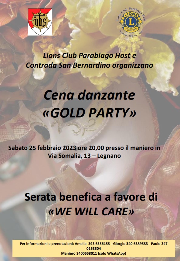 La Contrada San Bernardino, è lieta di ospitare, in collaborazione con il Lions Club Parabiago Host, nell’occasione del Carnevale, la cena danzante “Gold Party”, una serata benefica a favore dell’Associazione We Will Care.