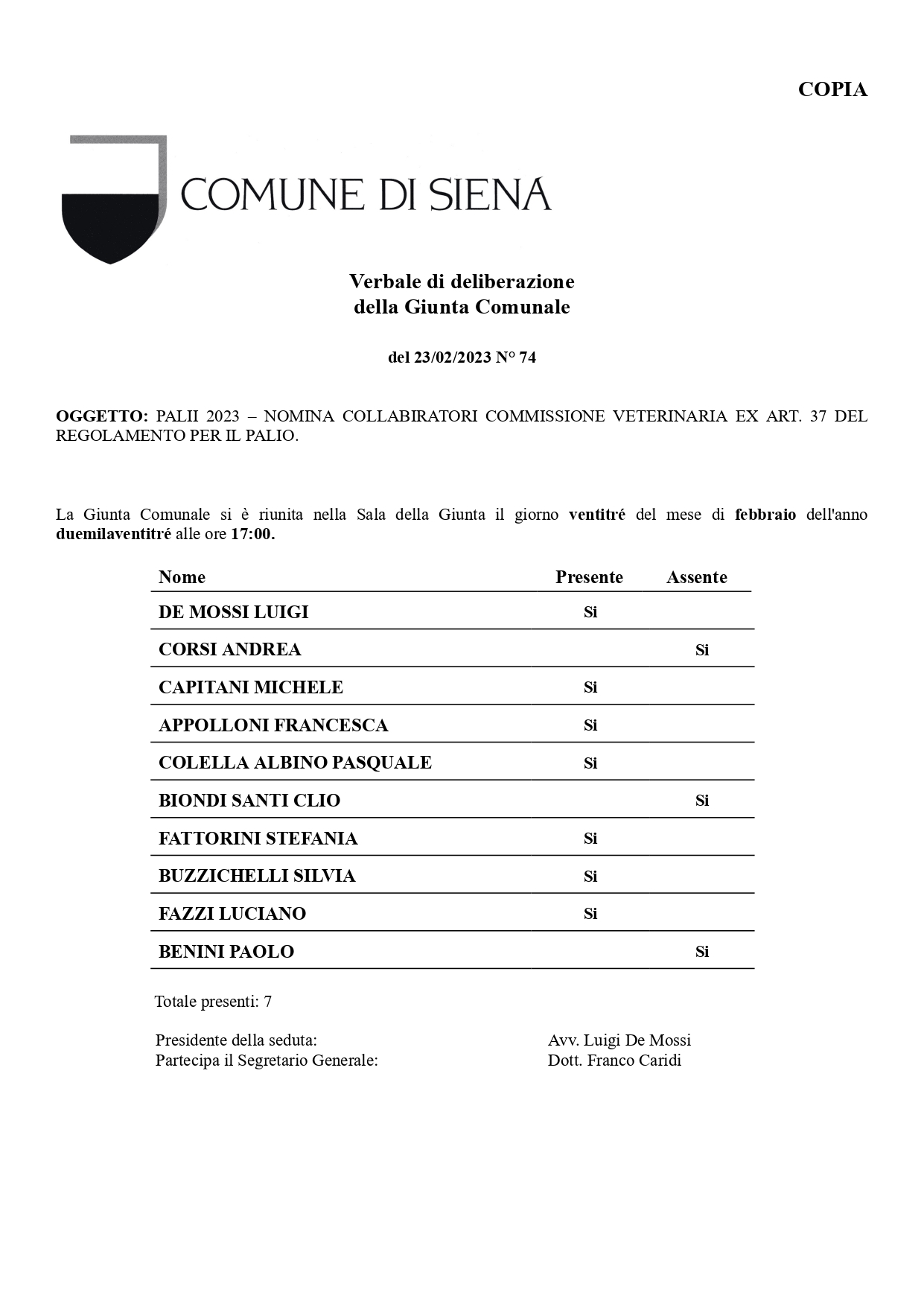 Nomina dei veterinari professionisti quali membri della Commissione Tecnica Comunale prevista dal Protocollo per l’addestramento dei cavalli da Palio per l’anno 2023