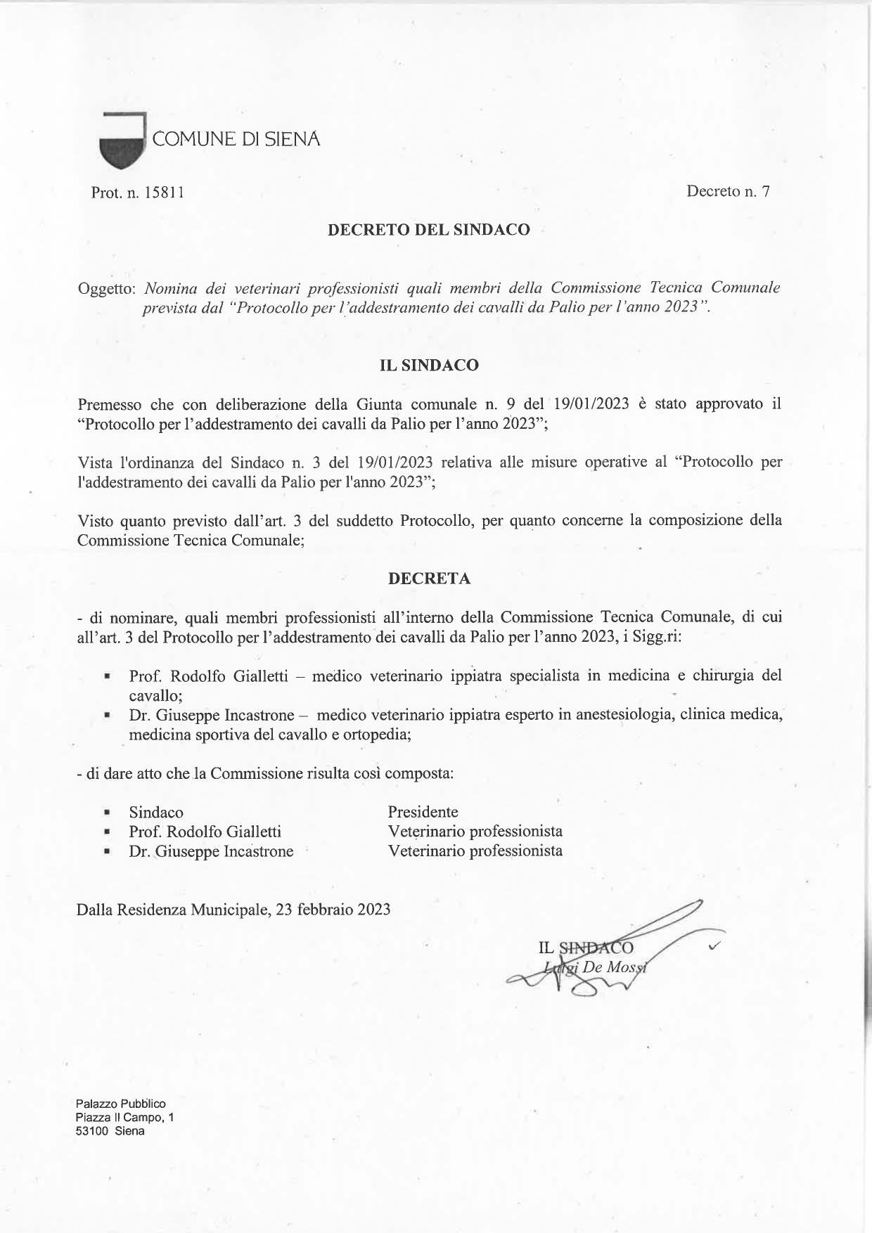 Nomina dei veterinari professionisti quali membri della Commissione Tecnica Comunale prevista dal Protocollo per l’addestramento dei cavalli da Palio per l’anno 2023