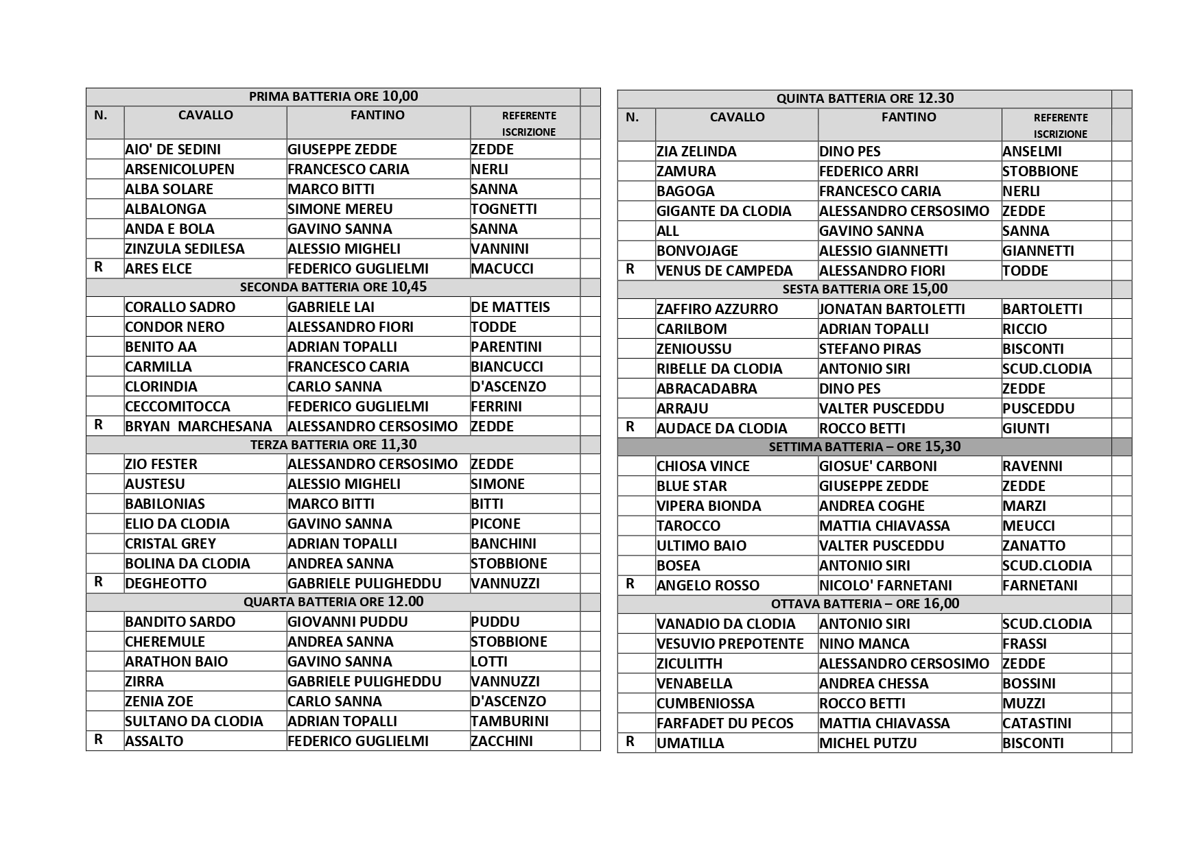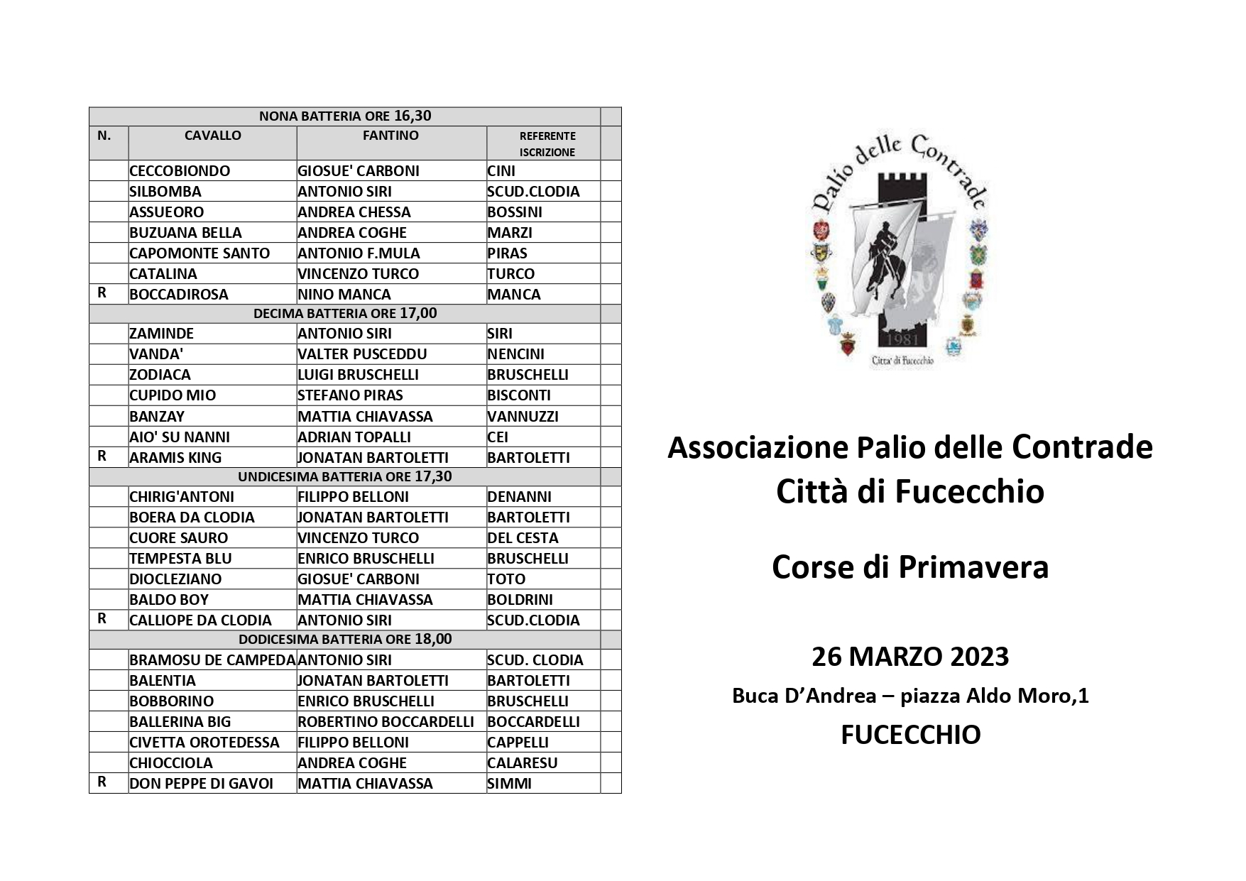 Mi sono giunte le batterie delle Corse di Primavera di domenica 26/03. Saranno 12 batterie con inizio alle 10.00 l’ultima della mattina in programma alle 12.30, pausa pranzo e ripresa nel pomeriggio alle 15.00. L’ultima in programma alle 18.00