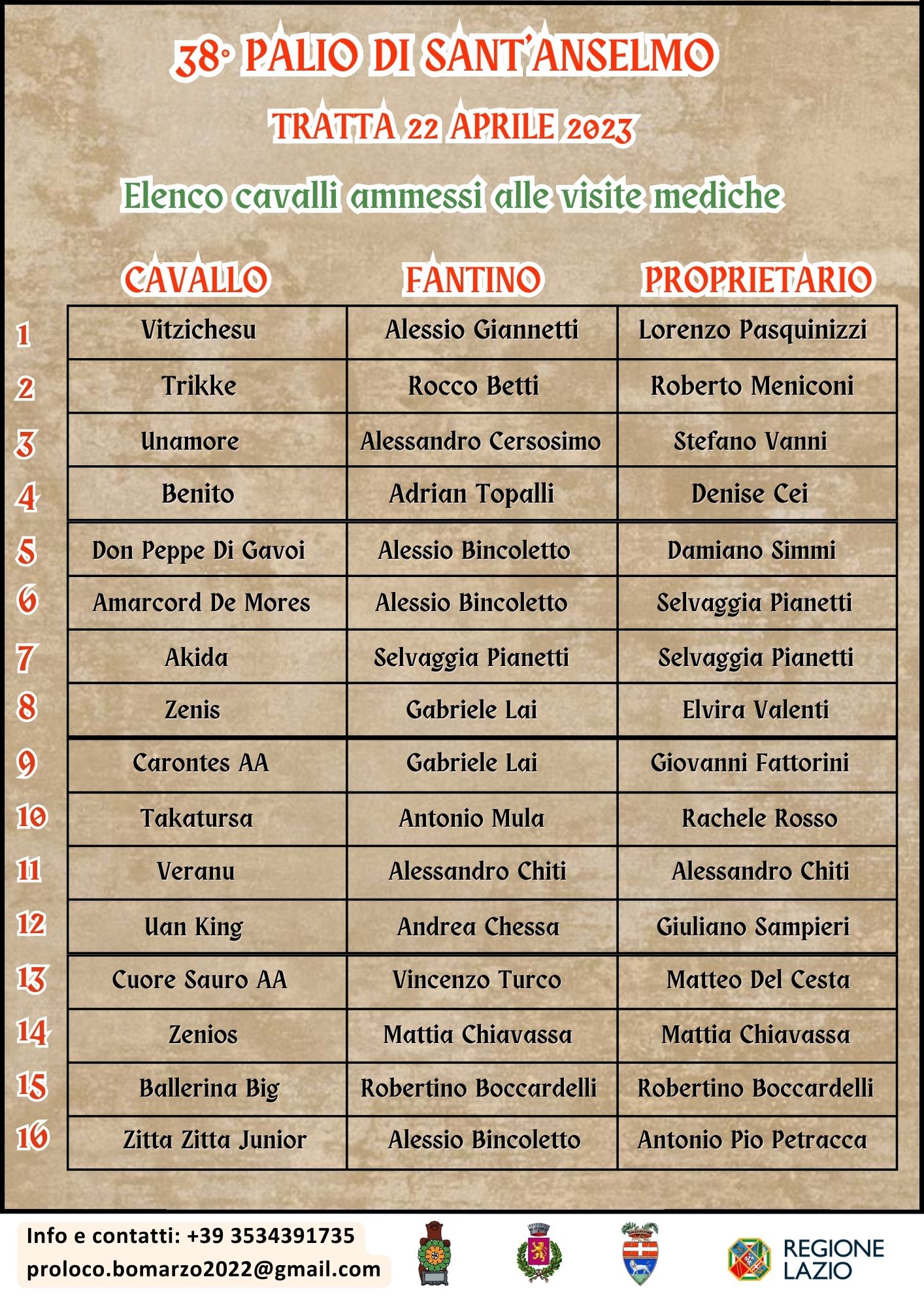 Ecco a voi l’elenco dei cavalli ammessi alle visite mediche della tratta che si disputerà il giorno 22 Aprile 2023 alle ore 15.30 presso il Campo del Fossatello!