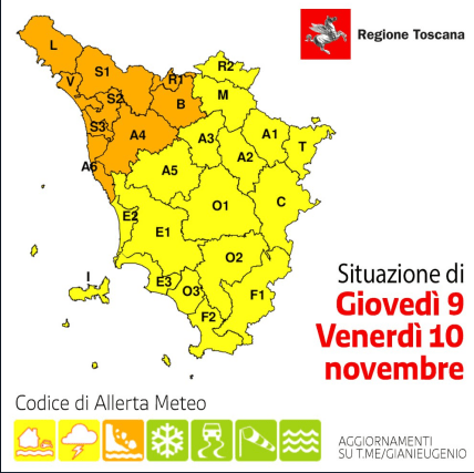 L’allerta è di codice arancione per rischio idraulico del reticolo minore ed idrogeologico nelle aree nord-occidentali della Toscana, in particolare il Valdarno inferiore, la costa settentrionale, le valli del Bisenzio, dell’Ombrone, del Serchio, la Garfagnana e la Lunigiana.