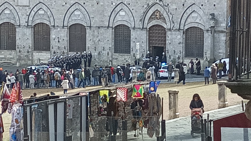 Al termine delle celebrazioni, il Corpo di Polizia Municipale ha voluto rendere omaggio al Comandante Manganelli con un saluto all’esterno di Palazzo Pubblico, accendendo le sirene dei mezzi parcheggiati a ventaglio sotto le trifore vestite a festa con i vessilli delle diciassette Contrade.