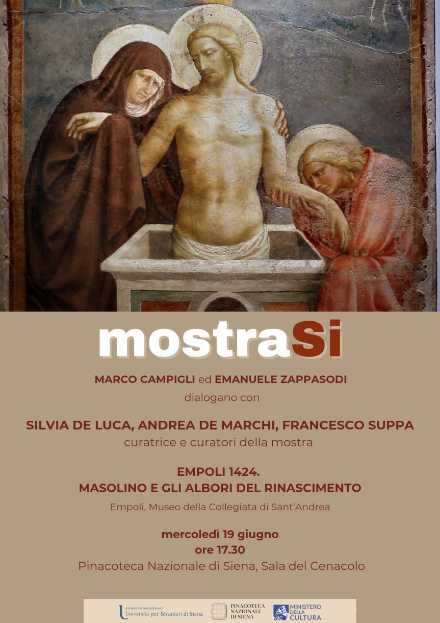 Ritorna mercoledì 19 giugno l’appuntamento con “MostraSI. Racconti e dialoghi d’arte”, il ciclo di incontri ideato dall’Università per Stranieri di Siena in collaborazione con la Pinacoteca Nazionale di Siena. Marco Campigli ed Emanuele Zappasodi dialogano con Silvia de Luca, Andrea de Marchi e Francesco Suppa curatrice e curatori della mostra: “Empoli 1424. Masolino e gli albori del Rinascimento” (Empoli, Museo della Collegiata di Sant’Andrea).