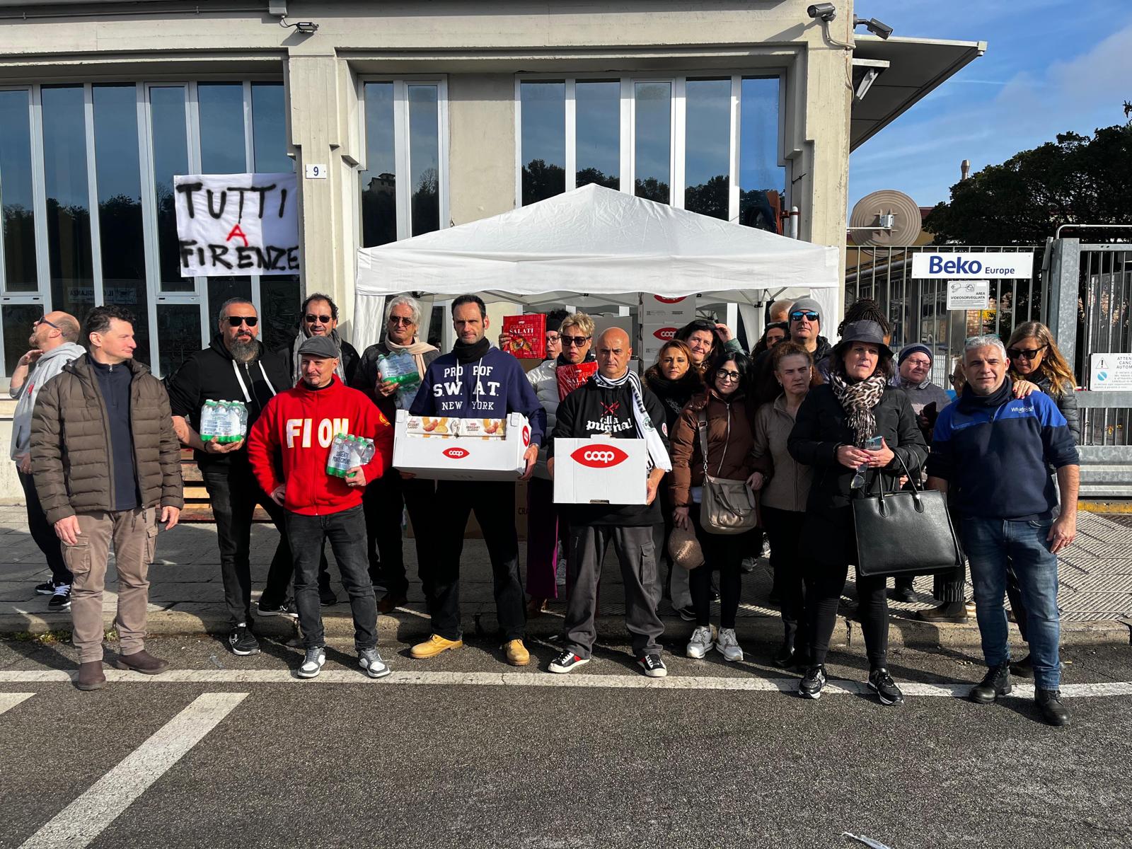 Acqua, latte, biscotti, merendine, succhi, schiacciate. Sono i prodotti consegnati questa mattina da Unicoop Firenze agli operai della Beko Europe in presidio davanti alla fabbrica dal 21 novembre scorso.