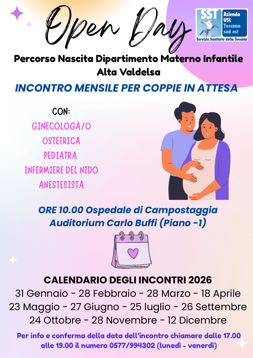 Con il 2026 ritornano gli appuntamenti con gli open day del Punto nascita dell’ospedale di Campostaggia, dove, una volta al mese, vengono aperte le porte ai futuri genitori interessati a conoscere i servizi offerti. Il primo appuntamento dell’anno sarà sabato 31 gennaio e verranno trattati i temi della fisiologia della nascita e del parto in acqua.